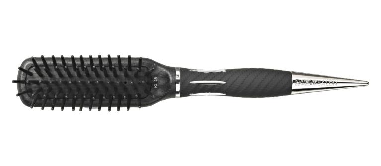 Bem-vindo a um novo nível de excelência. O punho ergonómico foi desenhado para adaptar-se a todos os tamanhos de mão, do delicado ao peso pesado, tem uma sensação enquanto macio e liso, é firme e levemente texturado para maior firmeza. Começando com um pescoço esbelto, os seis detalhes (frisos) cromados elevados oferecem o equilíbrio perfeito entre aderência e deslizamento, permitindo que trabalhe com a escova facilmente sem comprometer a estabilidade e técnica. Um corpo robusto com um punho que lentamente afunila terminando numa ponta polida suave para apanhar e seccionar o cabelo. A ponteira de metal foi trabalhada a partir de aço para equilibrar perfeitamente o peso da escova e gravada com as insígnias "Kent.Salon" adicionando á exclusividade das escovas, perfeição e qualidade inquestionável.