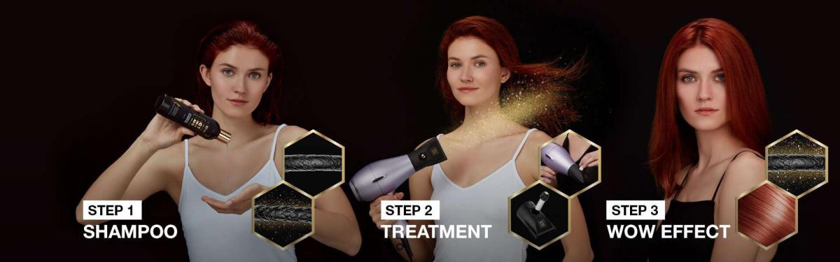 Insira a cápsula Hot Honey Care com o tratamento desejado no concentrador de secador de cabelo Elchim compatível. O tratamento será distribuído pelo ar do secador de cabelo nos comprimentos de forma fácil, uniforme e eficaz